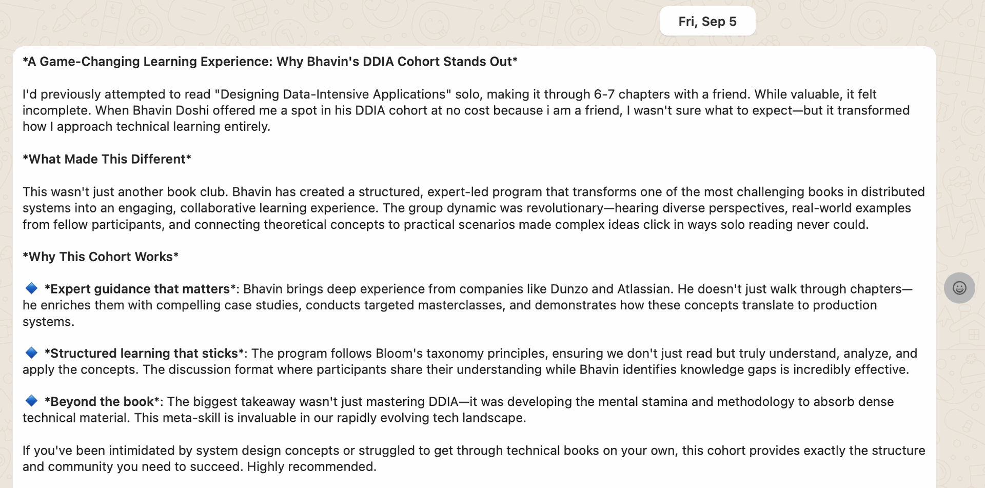 DDIA is usually very heavy for freshers. After about 2 years of industry experience, you should be ready to participate in this mentorship.
